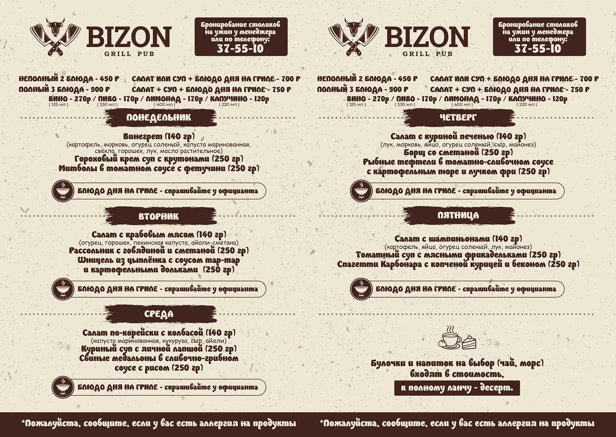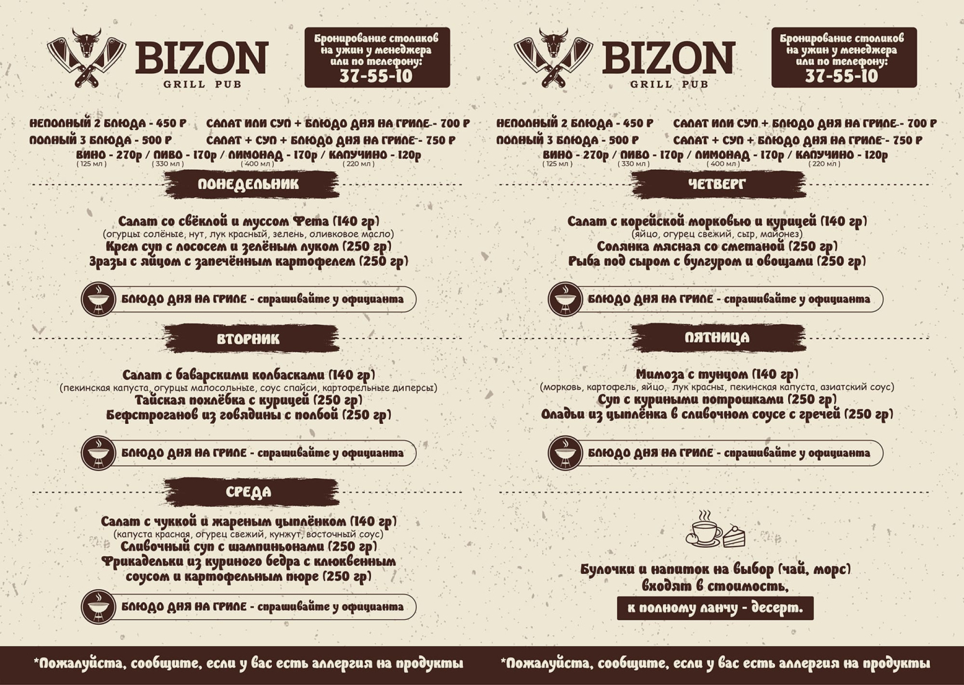 Оценив возможности онлайн-заказов, паб «Бизон» переходит на доставку еды в Саранске. Предлагает клиентам заказать удобным для них способом любое блюдо из меню, в котором широко представлены закуски, салаты, фирменные стейки, рыба и морепродукты, супы, гарниры, бургеры, горячие блюда. Все продукты будут приготовлены и упакованы непосредственно перед отправкой заказчику. Оплатить заказ можно наличными курьеру или картой.